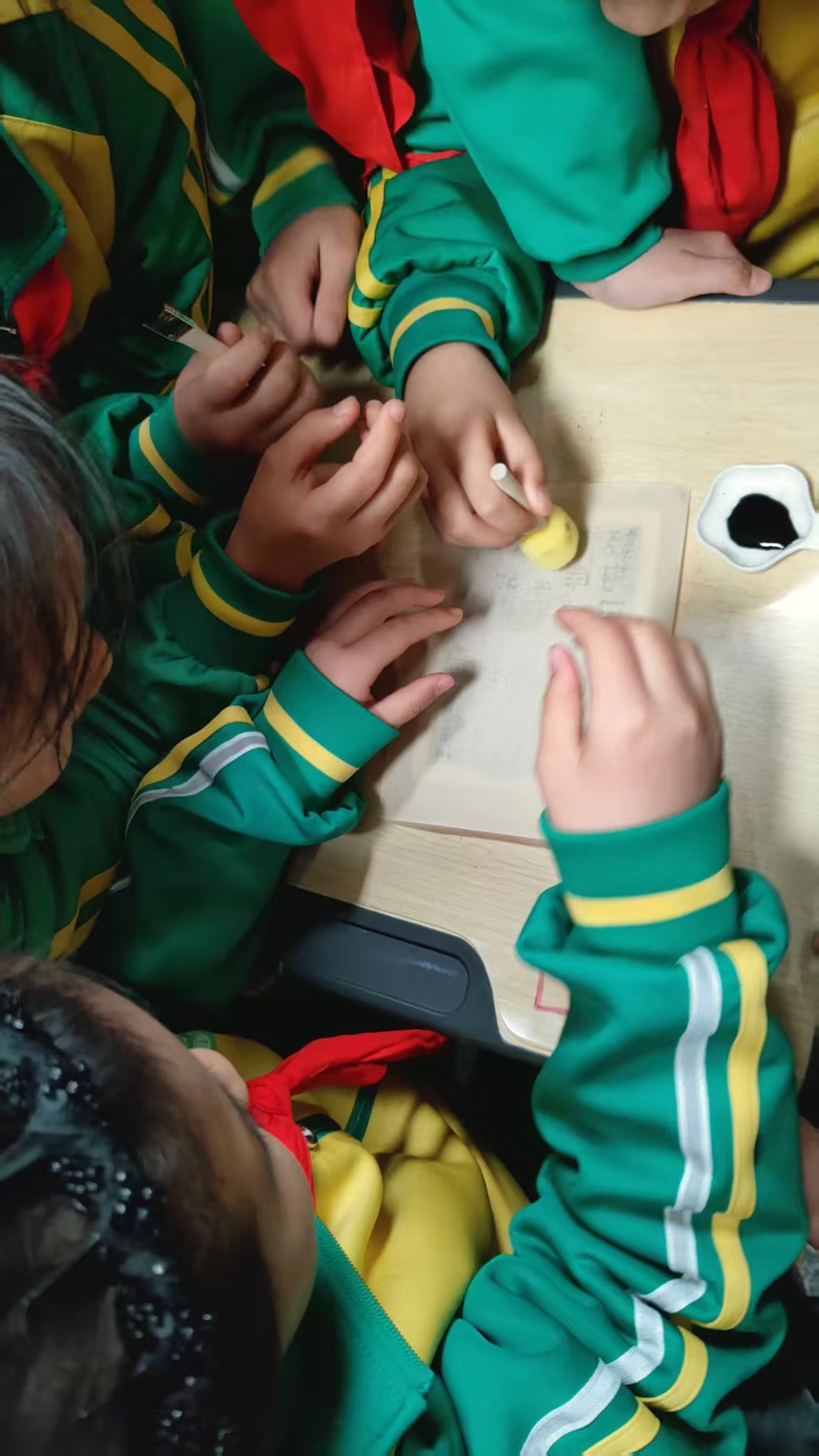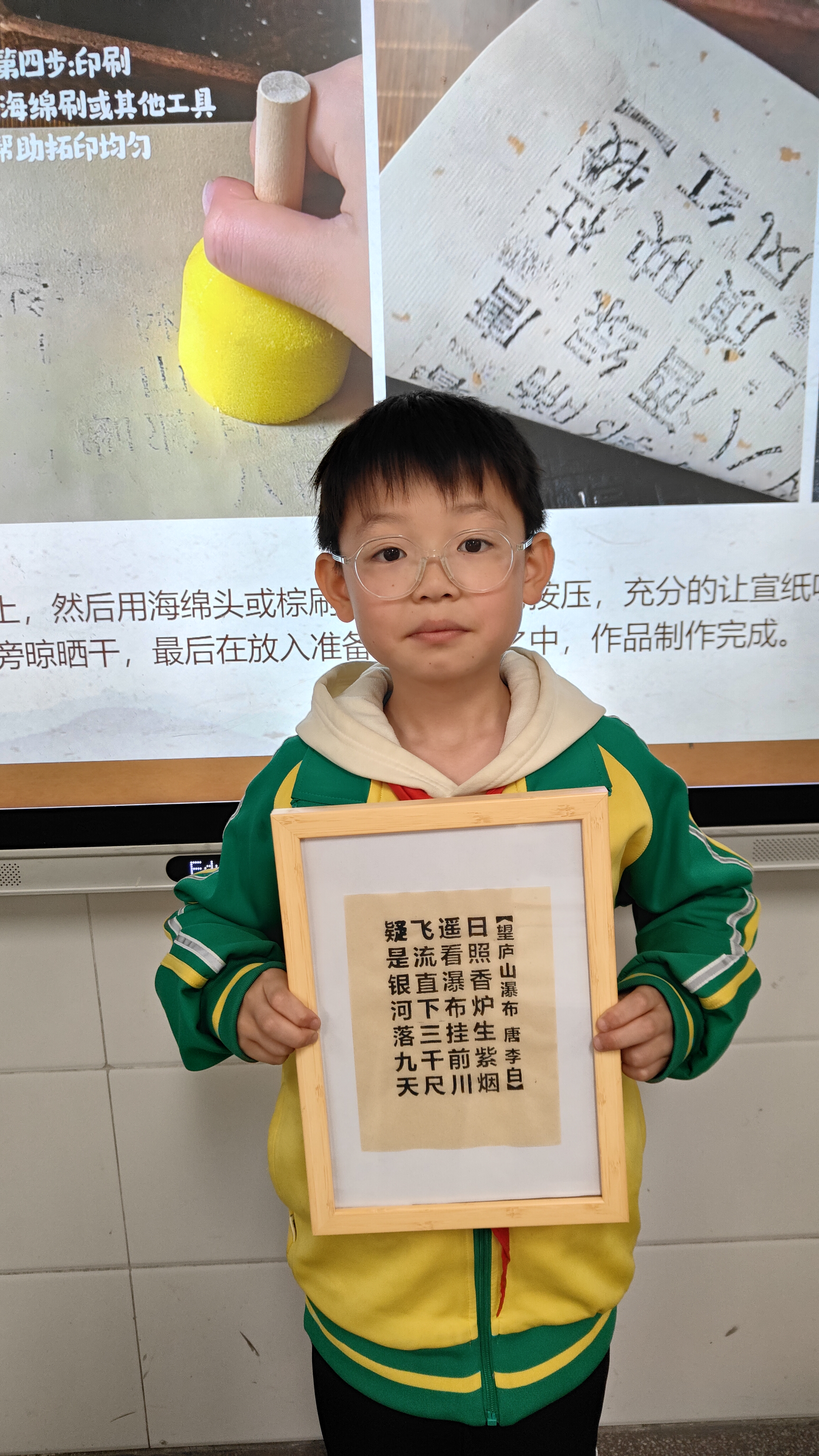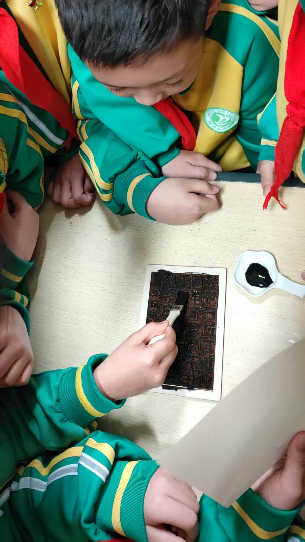 同学们拿着海绵头轻轻按压宣纸,在“唰唰”的声响里,一个个汉字从模具上“跳”到纸上,孩子们眼睛瞪得像小灯笼,比拿到新玩具还兴奋!每个孩子都成了文化传承的“主角”。