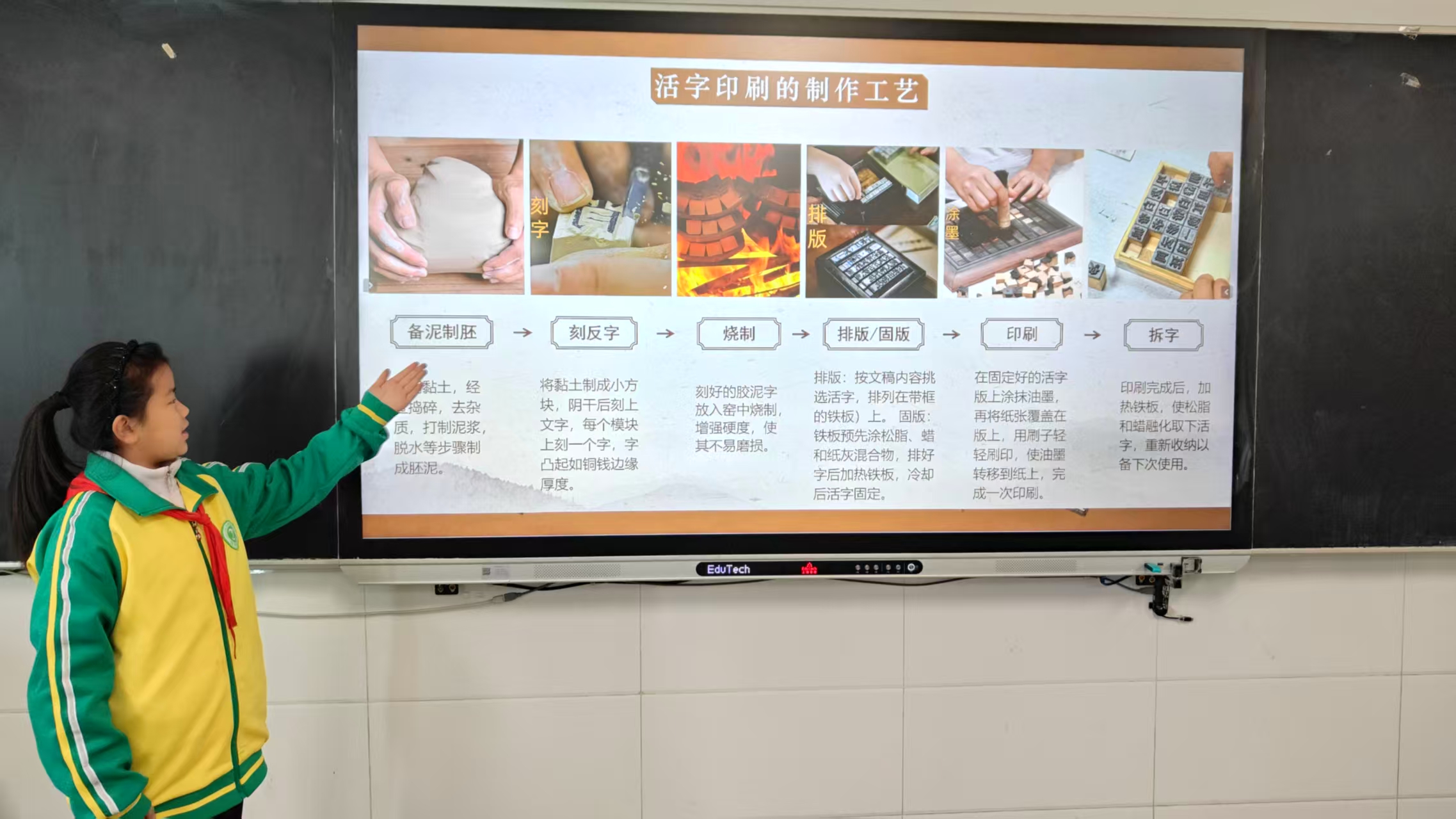 “活字印刷是四大发明之一!”在知识讲解环节,小讲解员们站在讲台前,把毕昇的故事讲得绘声绘色。从“泥活字”的诞生,到木活字的演变,再到现代活字元素的创意设计,比如活字吊灯、文创印章等。
