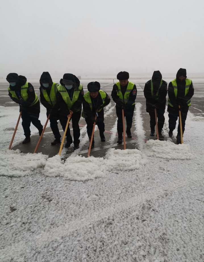 29日,受寒潮影响,临沂迎来2020年强度最强、影响最广的低温雨雪天气,最低气温降至零下11度,风大、雪急、温度低。为避免机场跑道出现积雪,保障航班正常运行,在气象台发布降雪预告后,临沂机场高度重视,组织召开了专题会,启动应急预案,提前准备部署充分,提前检修车辆,与协作单位协调好,调动应急队伍和装备物资,第一时间开展除雪防滑作业,全力保障机场的安全畅通。