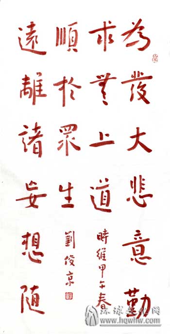 每作书,先静心,平息净虑,横竖撇捺,方折圆转,讲求法度,节制而得体的书风,与粗率狂躁“佻而无简,直而少致”的张扬时俗大异其趣。古人论笔法有言“正书无圆笔则无宕逸之致,行草无方笔则无雄强之神。”刘俊京先生既得其三味,又交相为用。其楷书端庄素雅,从容淡定,令人感受到一种儒雅的君子之风;其行书,融入碑版线质,笔力凝重,结体错变,风神跌宕而越趋精妙,渐成一家风貌。