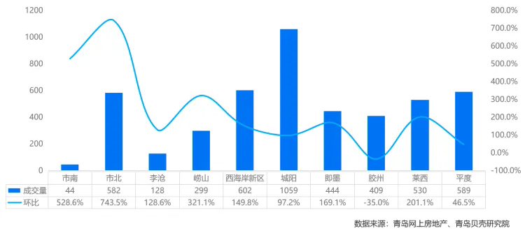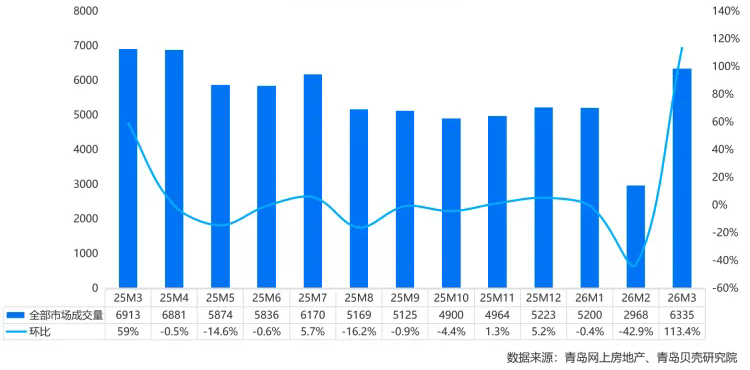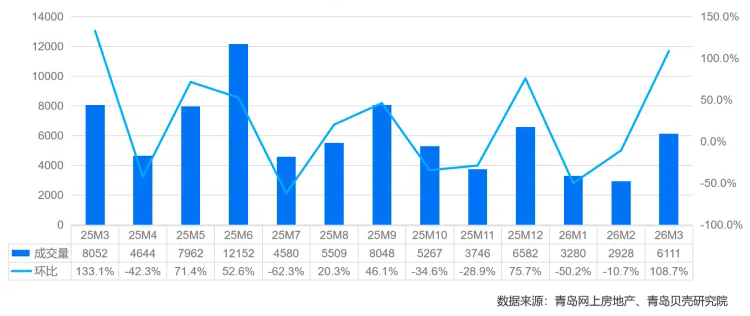 2026年春天的青岛楼市,正以一场超预期的“小阳春”验证市场底部的夯实。三月数据勾勒出清晰的复苏图景:全市新建商品住宅与二手住房合计成交12446套,环比涨幅达109%。其中,新建商品房成交6111套,环比上涨108.7%,成交均价同步回稳至16016元/㎡,环比上扬23%。