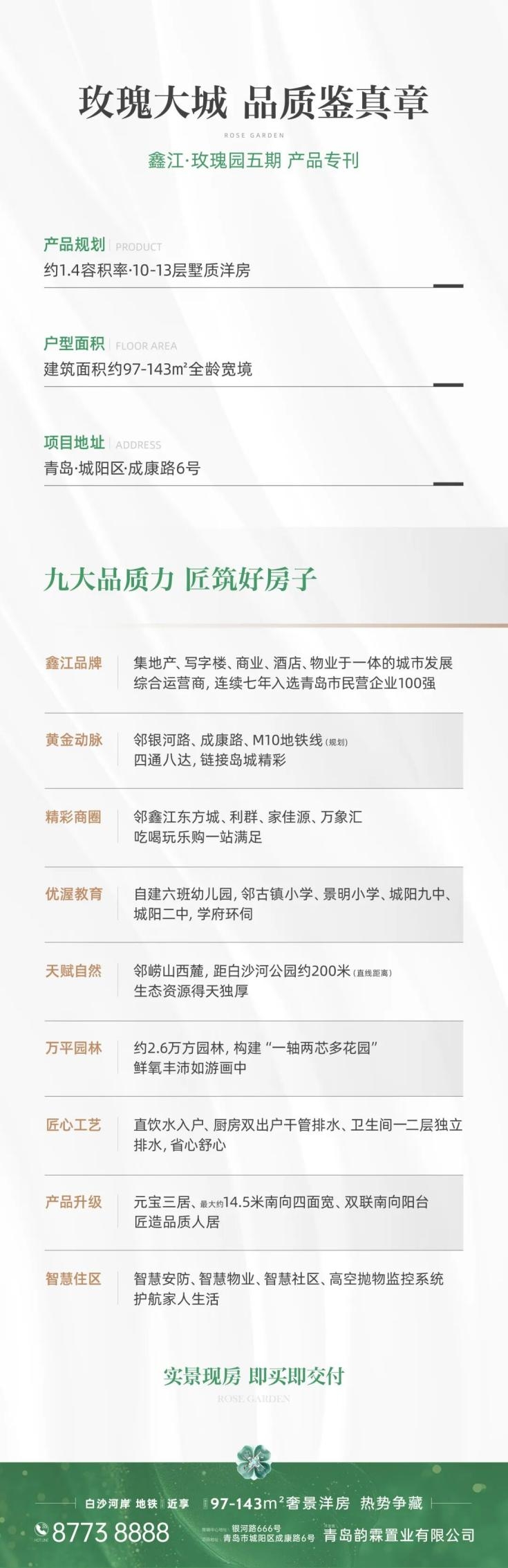 免责:项目区位示意对项目与周边环境、交通、公共设施的地理关系示意,旨在协助提供相关信息,不意味着公司对此作出任何承诺。鑫江·玫瑰园五期,开发商为:青岛韵霖置业有限公司;商品房预售证:“城行审三(2024)453号”,本资料为要约邀请,不作为要约或承诺;本宣传资料中所涉及的地铁10号线处于规划中,交通配套信息仅供参考。交通规划设置、市政配套设置不排除因政府规划、政策规定及出卖人未能控制的原因而发生变化,本资料旨在提供相关信息,不代表出卖人对此作出要约或承诺;景观视野因楼栋分布、楼层高度、房屋位置等因素有所差异,项目核心景观视野并非全部房屋均具备,绝不构成任何承诺或保证,具体请买受人实地勘察确认,资料中涉及的各类设备、材料品牌、园林景观配置标准仅供参考,敬请悉知买卖双方的权利义务以双方签订的《商品房买卖合同》及其补充协议、附件等书面文件为准;本资料所发布内容为2026年4月21日前的信息,出卖人将不定期对宣传材料进行修改,敬请留意最新资料。