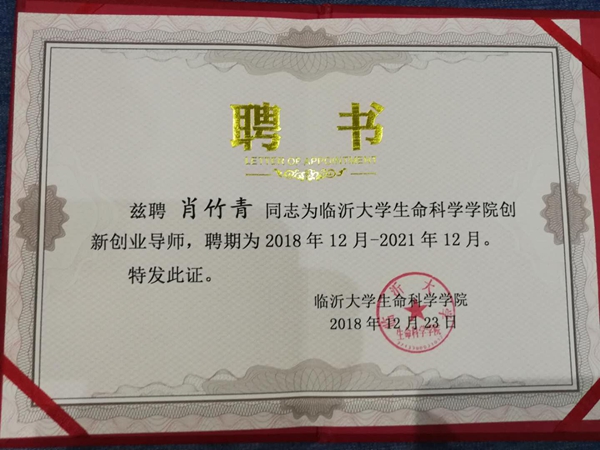 此次会议奠定了肖竹青作为企业代表全面与临沂大学展开校企合作的基础。同一日,临沂大学历史文化学院第一届理事会第二次会议上,肖竹青被聘任为创新创业导师。