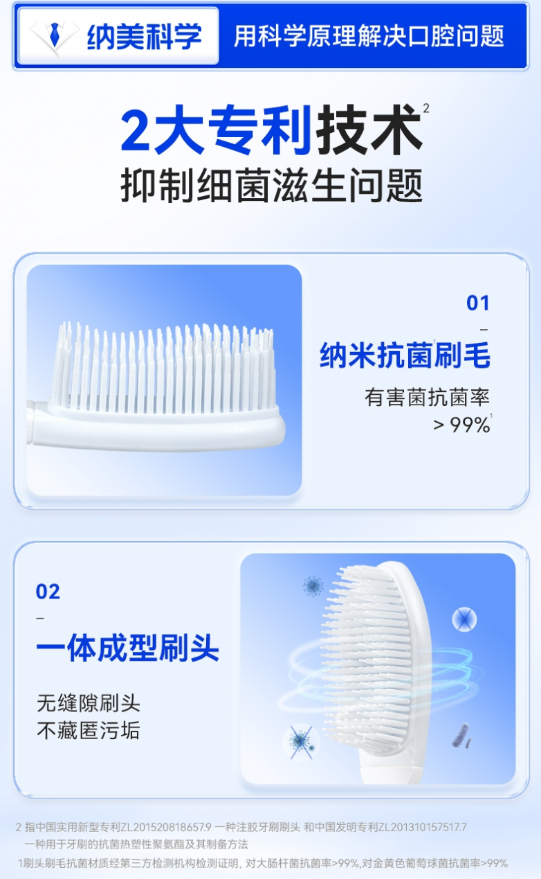 纳美科学抗菌软胶牙刷独家搭载两大专利技术,构筑起坚实的口腔健康屏障。其一为纳米抗菌刷毛,经权威第三方检测机构验证,对常见有害菌的抗菌率超过99%,可以从根源上减少细菌的附着与滋生,保持刷头、刷毛持久清新。其二为一体成型刷头,整个刷头无缝衔接,彻底杜绝了传统牙刷因刷毛植入孔洞而藏污纳垢的问题,易于冲洗,保持洁净,让每一次刷牙都始于一个真正干净的“工具”。