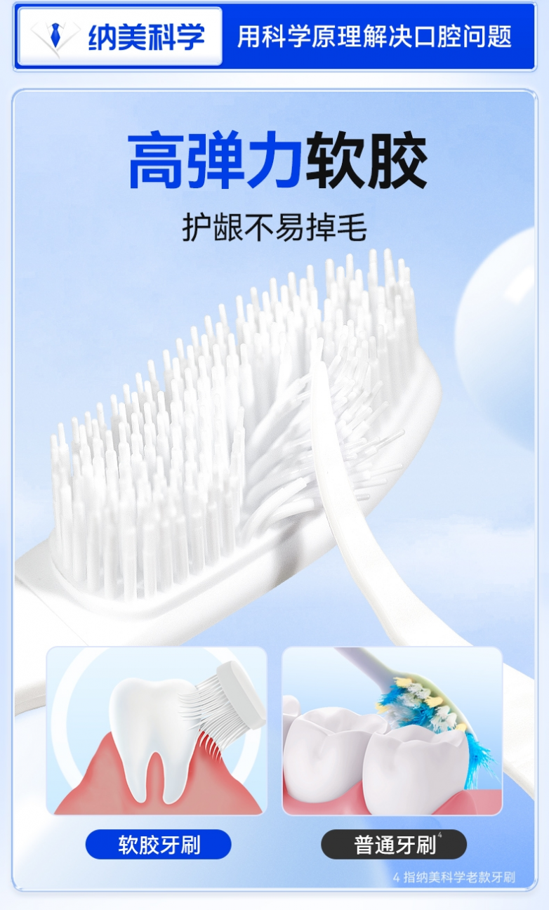 纳美科学抗菌软胶牙刷的核心革新,在于高弹力软胶刷毛。这种特殊材质拥有卓越的柔韧性与回弹性,能在接触牙齿和牙龈时产生缓冲,实现类似按摩般的触感,有效清洁的同时无惧划伤牙龈。其不易倒毛、炸毛的特性,也确保了刷毛寿命与持久清洁力。更重要的是,产品采用食品级接触材料,从刷毛到刷柄,安全标准严苛,让孕产妇、老人等各年龄段家庭成员都能安心入口,彻底消除了对刷牙工具本身安全性的顾虑。