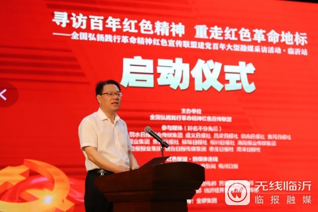 临沂日报报业集团党委书记、董事长梁绍伟在致辞中说:“习近平总书记视察临沂时指出,‘水乳交融,生死与共’的沂蒙精神与延安精神、井冈山精神、西柏坡精神一样,是党和国家的宝贵精神财富,要不断结合新的时代条件发扬光大。总书记的殷切嘱托和充分肯定,对于弘扬沂蒙精神具有重大而深远的时代意义。本次红色宣传联盟开展建党百年大型融媒采访·临沂站活动是落实习近平总书记视察临沂时重要讲话精神的具体实践。”他指出,在建党100周年纪念日即将来临之际,临报集团充分发挥党媒的时代责任与使命,通过举办“寻访百年红色精神 重走红色革命地标——建党百年大型融媒采访活动”,汇聚红色精神发源地党媒,以期通过全方位寻访红色地标,来深入挖掘革命故事、追寻红色精神源头、展现革命精神在传承中焕发出的时代光芒,为新时代前行汲取更为强大的奋进力量。
