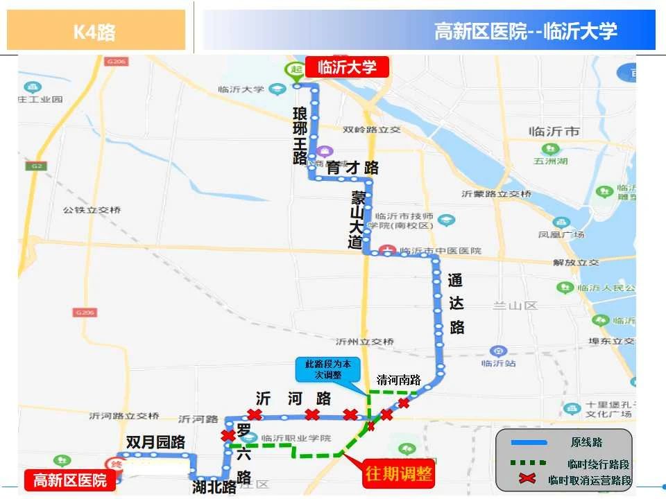 K4路由临沂大学运行至高新区医院,K16路由长途汽车站运行至高新区换乘中心、K25路由北城分公司运行至模具产业园、K66路由陈白庄社区运行至凤凰庄、K68路由南坦小区运行至模具产业园、K69路由陈白庄社区运行至临沂太一医院、K70路由人民医院东医疗区运行至模具产业园、K101路由解放路换乘中心运行至褚墩、K103路由陈白庄社区运行至涧头、K116路由陈白庄社区运行至北大埠村。以上线路调整后将取消通达路(清河南路至沂河路)路段的运营,临时调整至通达路—清河南路—蒙山大道—通达路恢复原线路运营,临时取消停靠站点3处:盛庄派出所、永盛门、金九路路口,新增一处站点:永盛路口。