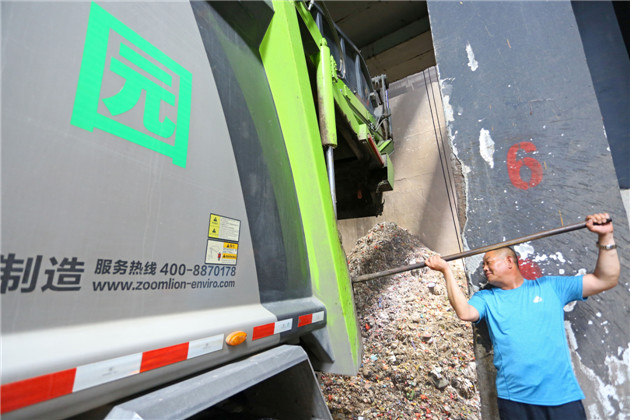 (工作人员正在把生活垃圾整理到发酵区。)