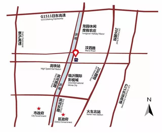 济南、泰安、淄博、莱芜、滨州、德州、上海、北京、天津、郑州方向:京沪高速-临沂北出口-东行20公里