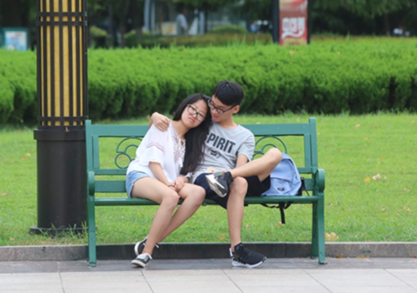 广场周围处处可见依偎在一起的情侣。记者廖杰摄