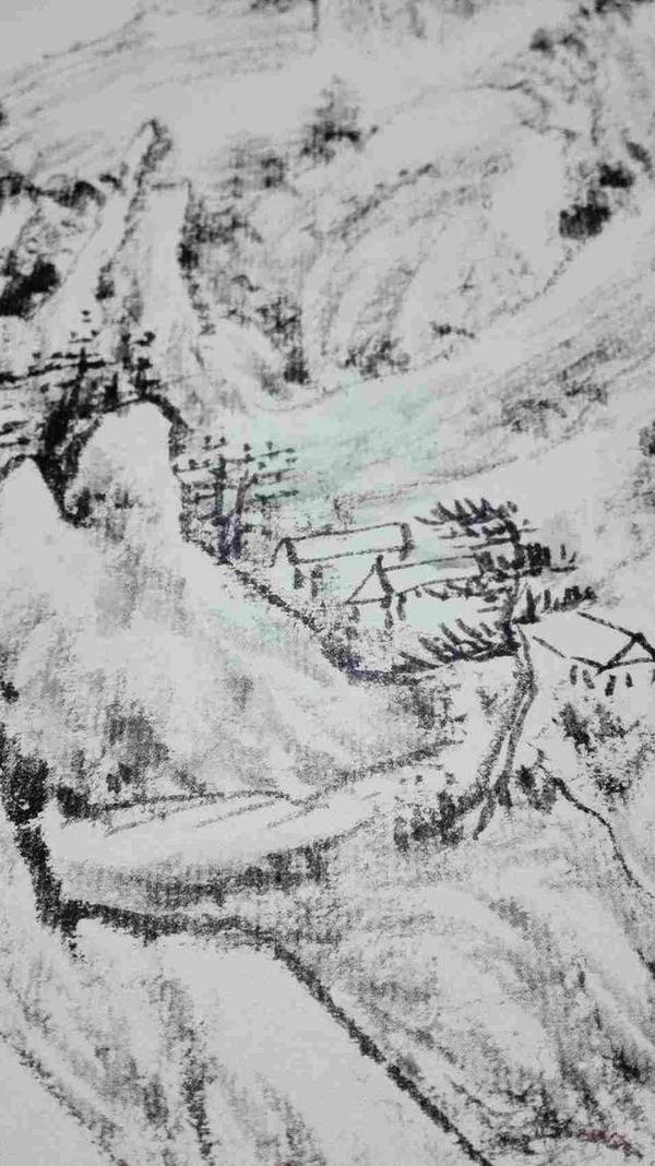 “港上舟中,西望暮烟暗淡,横截山,捥溪流。乱石丛多泉声虢虢,夕阳西坠,山光更明”。画稿上,平远的江岸上斜着三五家瓦房,前后两丛疏林,渡头泊着一双小舟。远山如带,江流平缓。江对岸,宾虹老人画得兴起,此刻正在这画稿的右上角吟哦着属于他的句子。